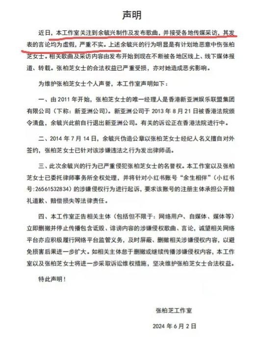 11. 其工作室随即发布严正声明指出,AEG早在2013年便已完成清盘程序,停止一切运营活动,而余毓兴本人也已退出公司管理层。但他却在2014年仍以张柏芝经纪人的名义对外签署商业合约,严重侵害其个人声誉与职业利益。