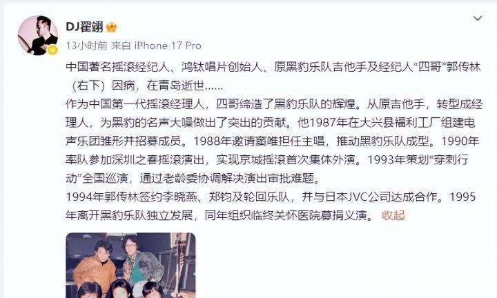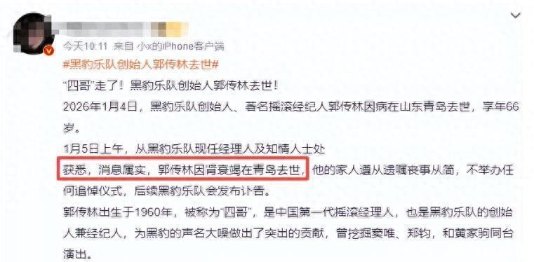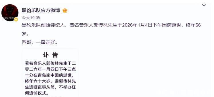 而今年的他,也不过66岁。01近日,黑豹乐队官方微博,发布了一个不幸的消息。其创始经纪人、著名经纪人——郭传林(四哥),于1月4日,不幸在青岛家中,因为肾衰竭不幸去世。