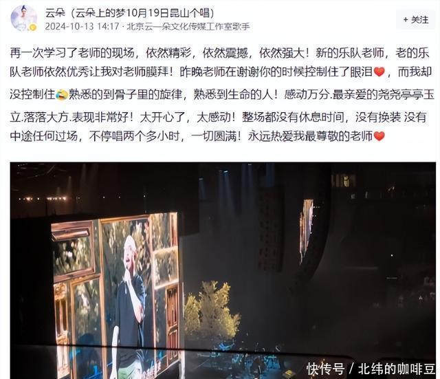 03 面对外界铺天盖地的质疑,云朵率先表态。 去年10月份,她在社交平台发文,晒出了刀郎演唱会的视频,并配文长文表达对恩师的感谢。