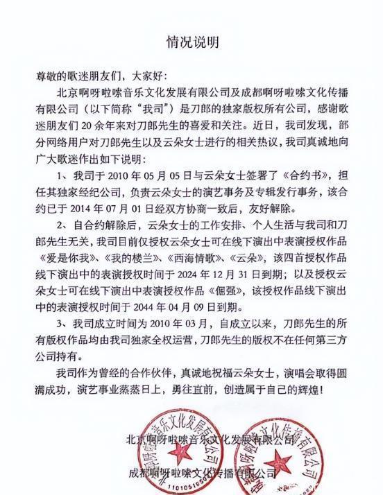 两人扑朔迷离的关系也终于真相大白。 声明中明确表示,刀郎跟云朵早在14年就解除了合约,双方不再存在商业合作。